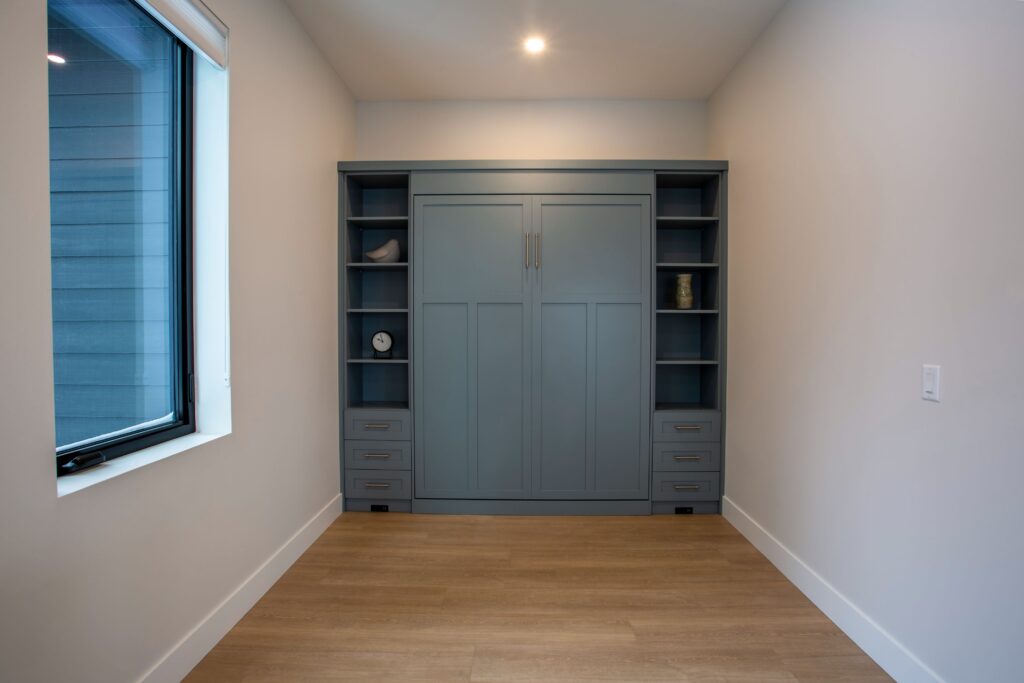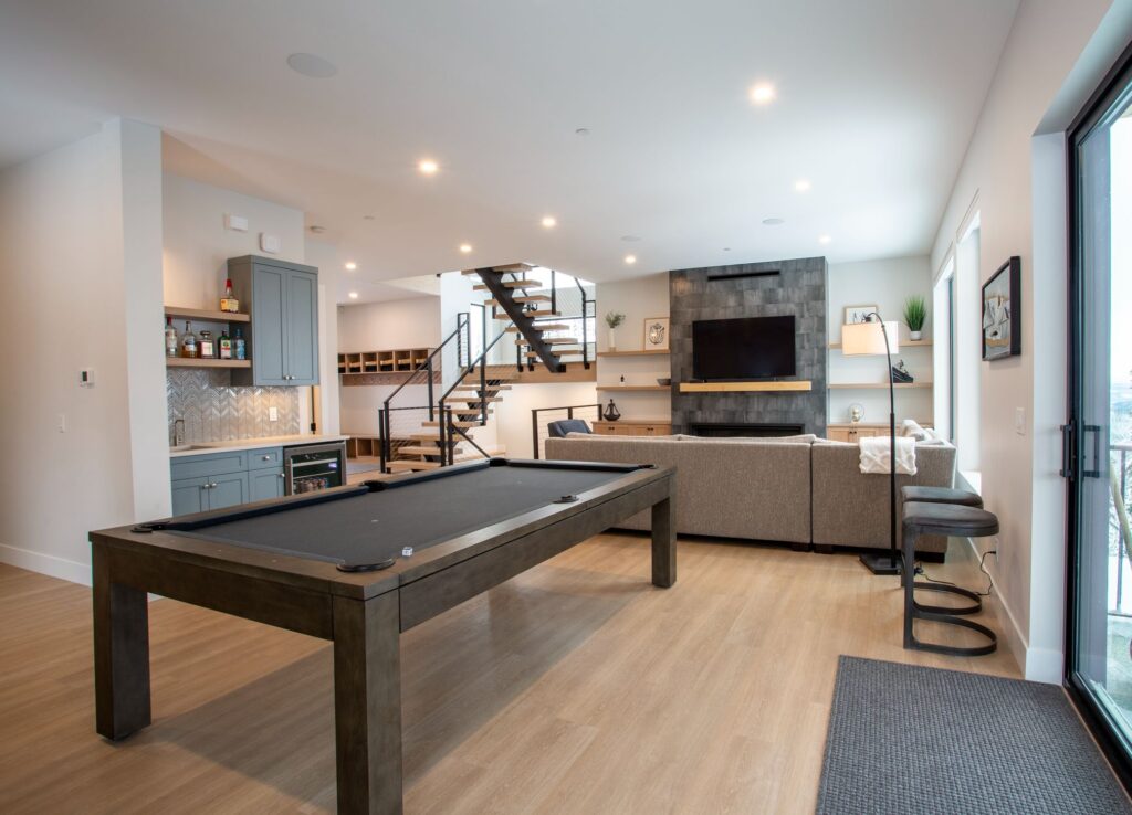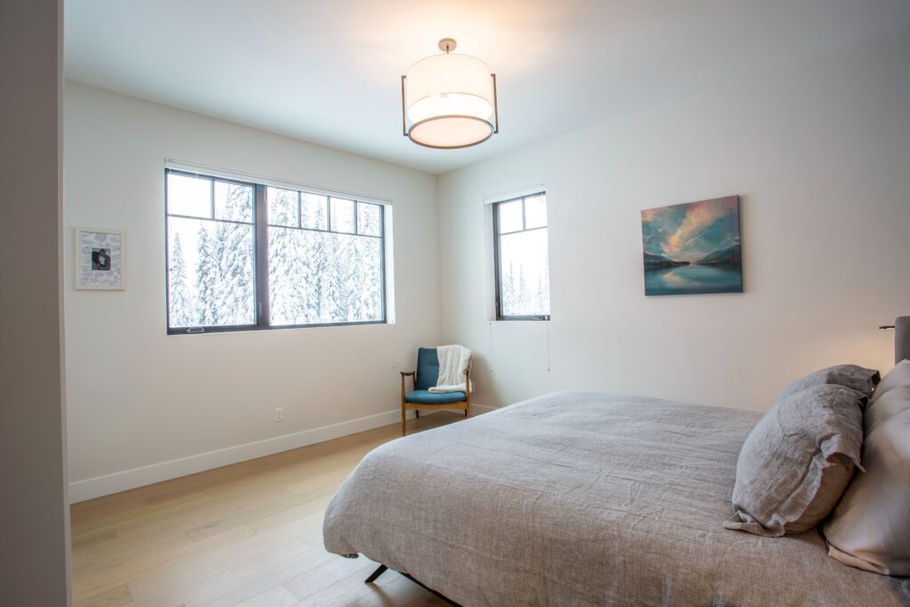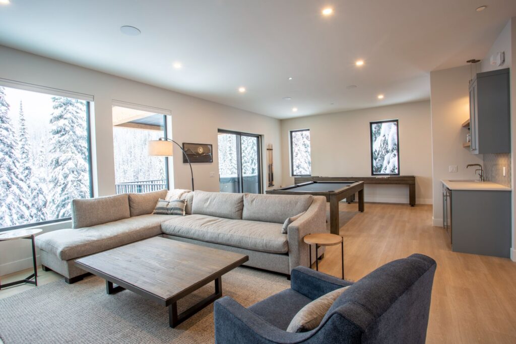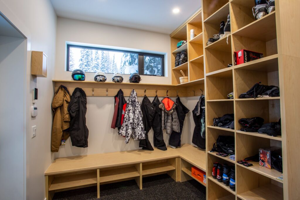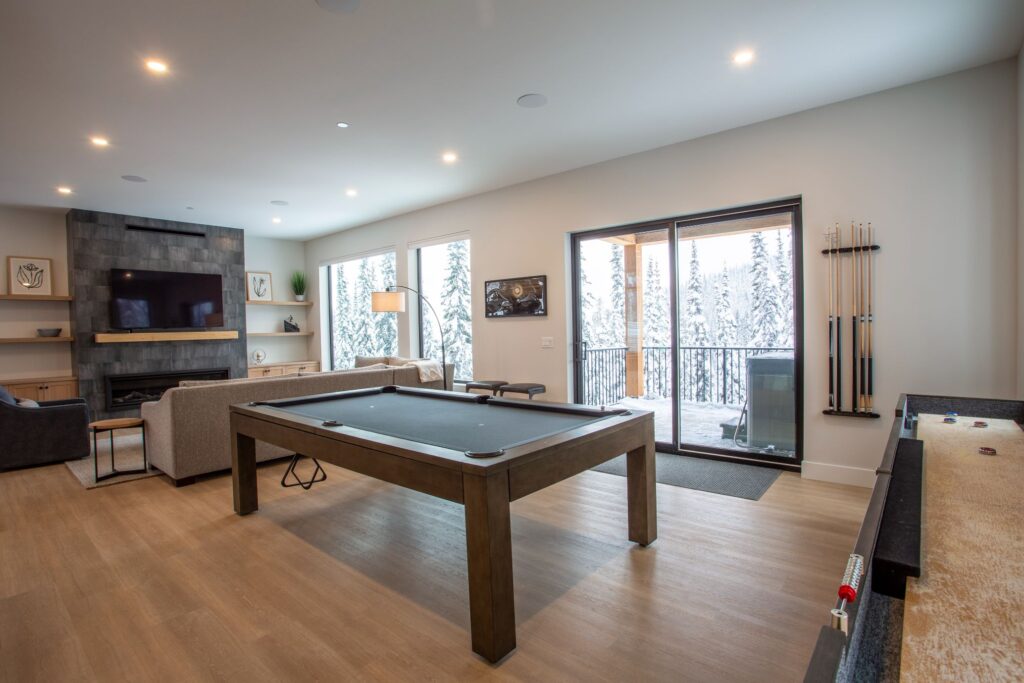 The front foyer of this spectacular home is designed with ample boot and coat storage, creating an inviting and welcoming entrance that leads right into the cozy living room and recreation rooms. For additional accommodations, a custom-built murphy bed is tucked away in this area, allowing the homeowners to make the most of their space. The main floor of this home offers an inviting and open layout with a spacious living area, a cozy dining room, and a stunningly designed kitchen that is perfect for entertaining. All of these rooms offer captivating views of the majestic mountain scapes and lush trees, creating an atmosphere of peace and serenity. The lower floor of the home offers two cozy bedrooms with custom-made bunk beds, an exercise room, and a large storage area for ski boots and ski equipment with direct access to the nearby ski slopes.