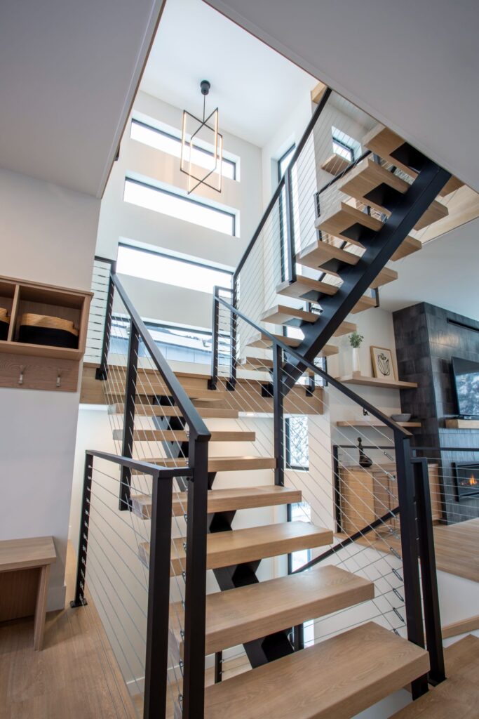 The three levels of the home are seamlessly connected by a stunning open stairway with stairs that appear to be floating, surrounded by beautiful windows that let natural light in, and with an elegant and unique modern cable railing system.