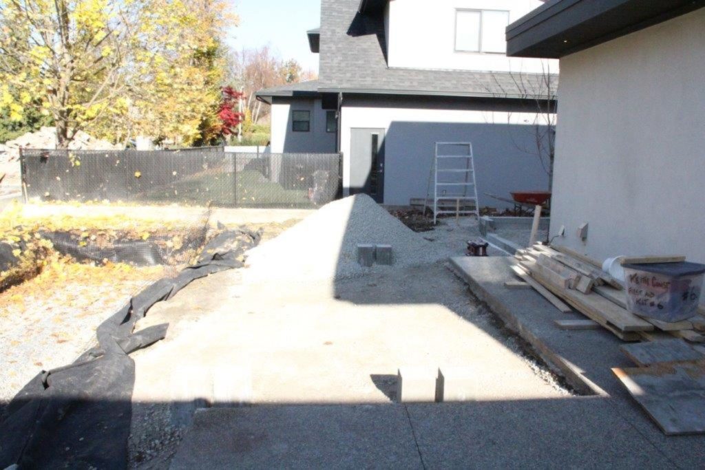 This backyard was transformed from drab space with no privacy to one with an eye-catching pool, tasteful landscaping and privacy from the neighbors. The “Sea Can” (shipping container) pool was placed in a concrete surround and features a variety of colored lights, trex steps and a trex cover for the mechanics. The landscaping exhibits ground cover and plants in a natural setting with exposed concrete slabs that surround the pool, ground lighting and a large, new covered sitting area to come to after an afternoon at the pool. The linear gas fireplace and globe light provide the finishing touches. The custom designed privacy fencing and gate complete this backyard that anyone would want to come home to in the sunny Okanagan!