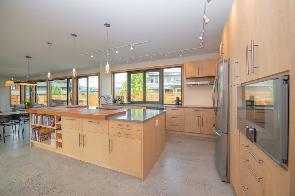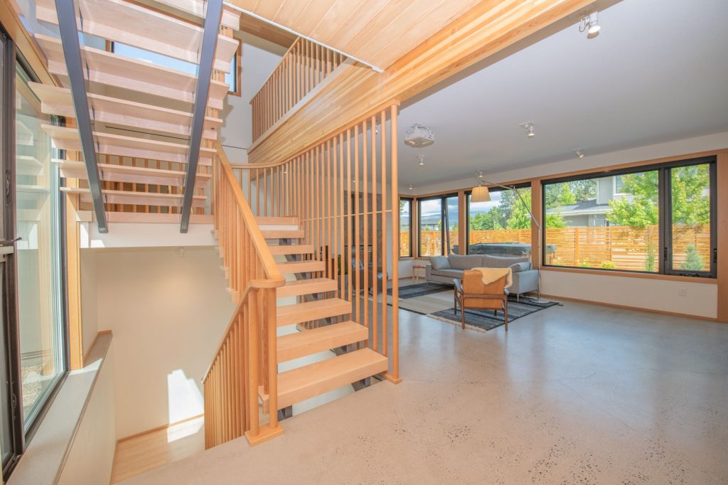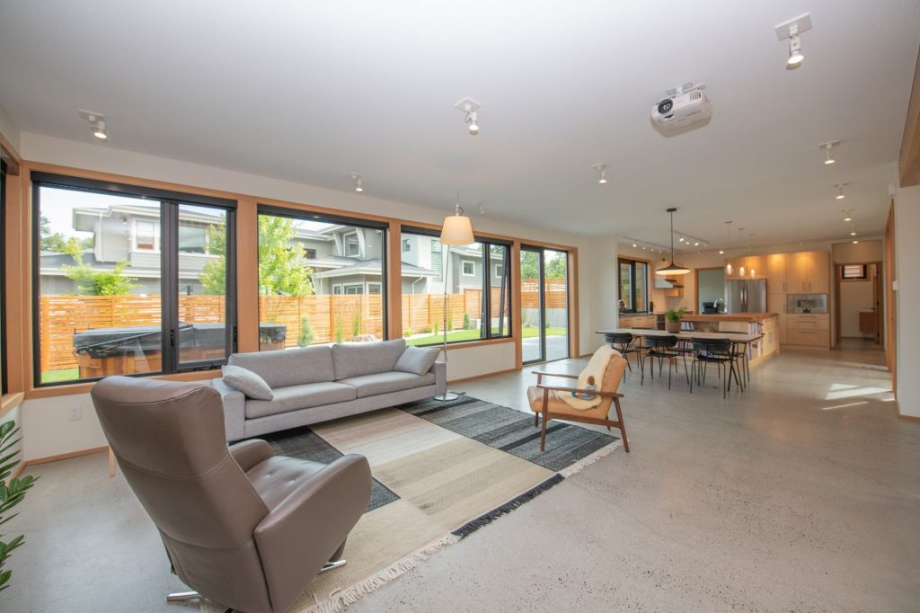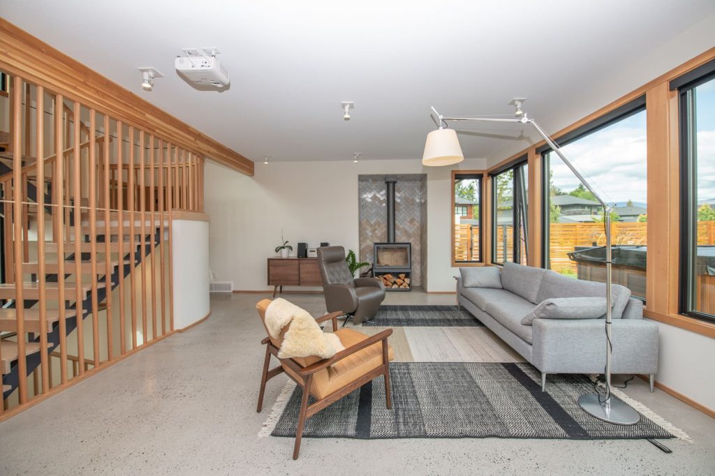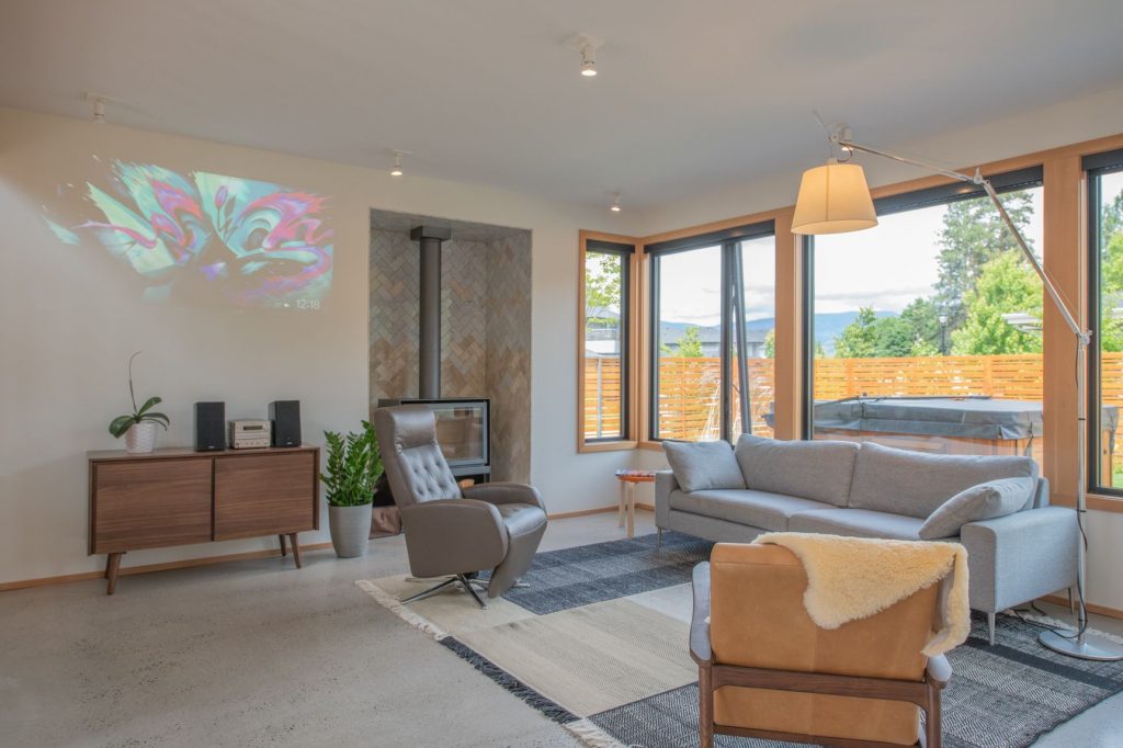 Upon entering the home, the polished concrete floor, neutral palette and floor to ceiling windows create a serene and calming feel. This gorgeous main level boasts a modern kitchen with full waterfall butcher block, wine rack and solid surface countertops. A feature wood glulam beam, ceiling projector which displays directly on the wall, and a tiled niche with wood burning fireplace give this cozy living room a minimalist feel.
