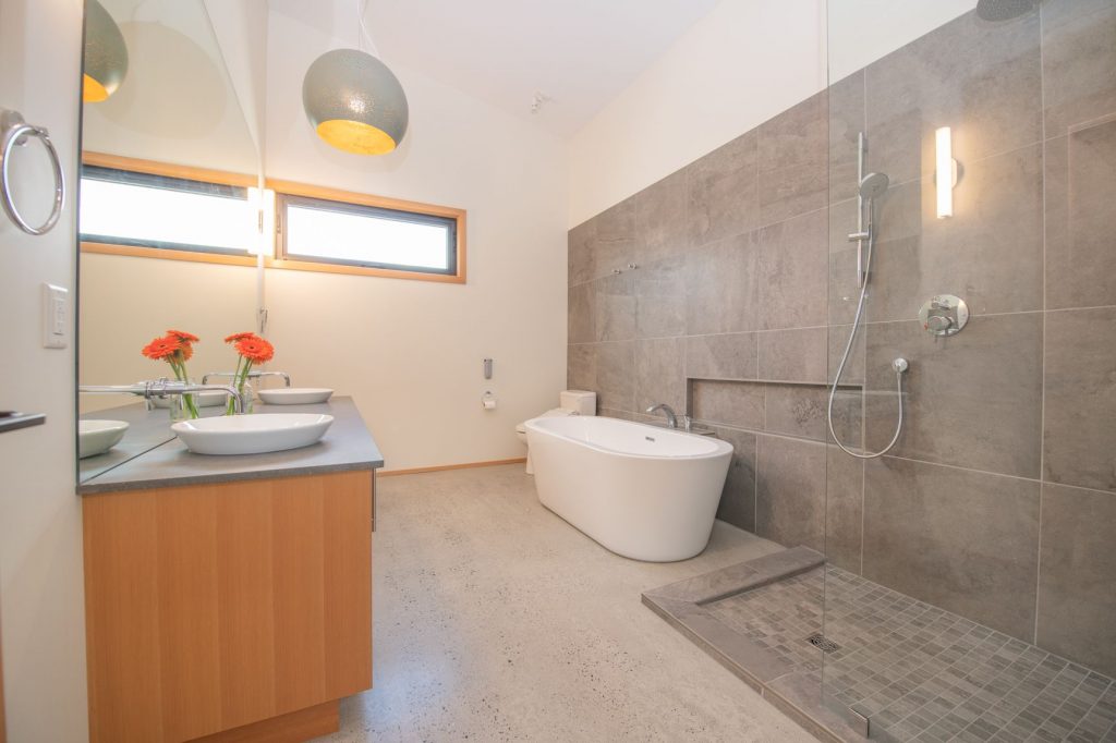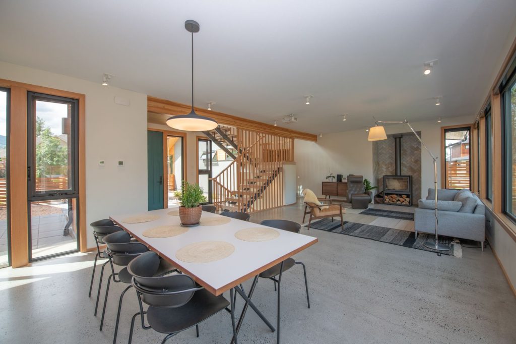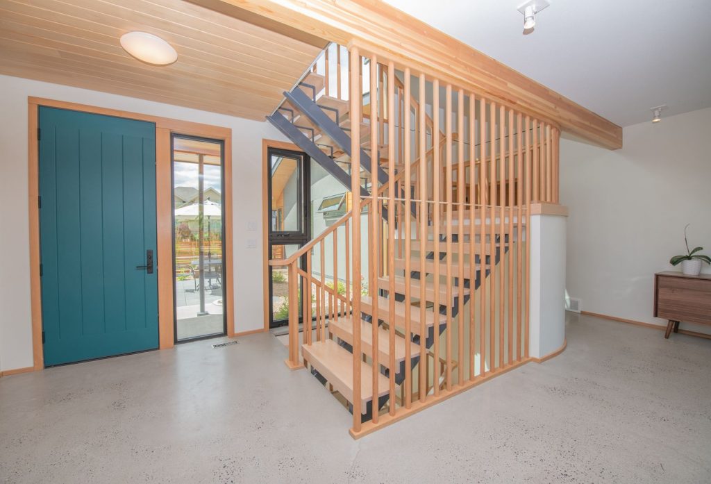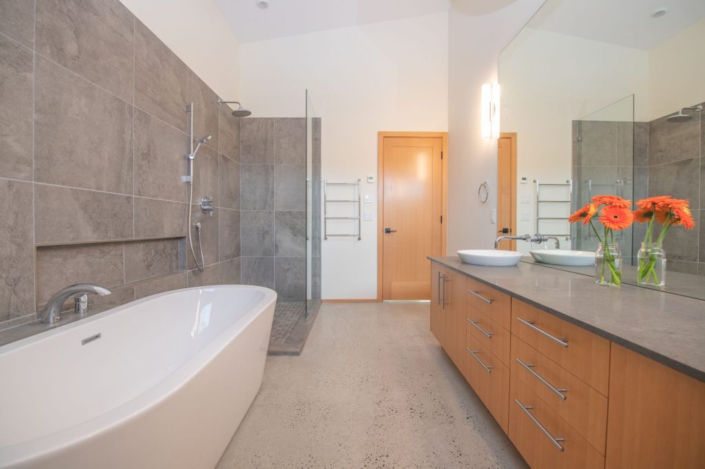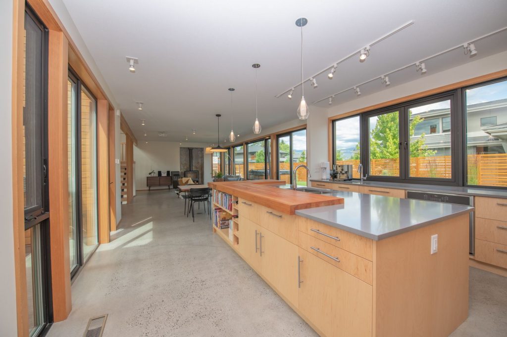Upon entering the home, the polished concrete floor, neutral palette and floor to ceiling windows create a serene and calming feel. This gorgeous main level boasts a modern kitchen with full waterfall butcher block, wine rack and solid surface countertops. A feature wood glulam beam, ceiling projector which displays directly on the wall, and a tiled niche with wood burning fireplace give this cozy living room a minimalist feel.
