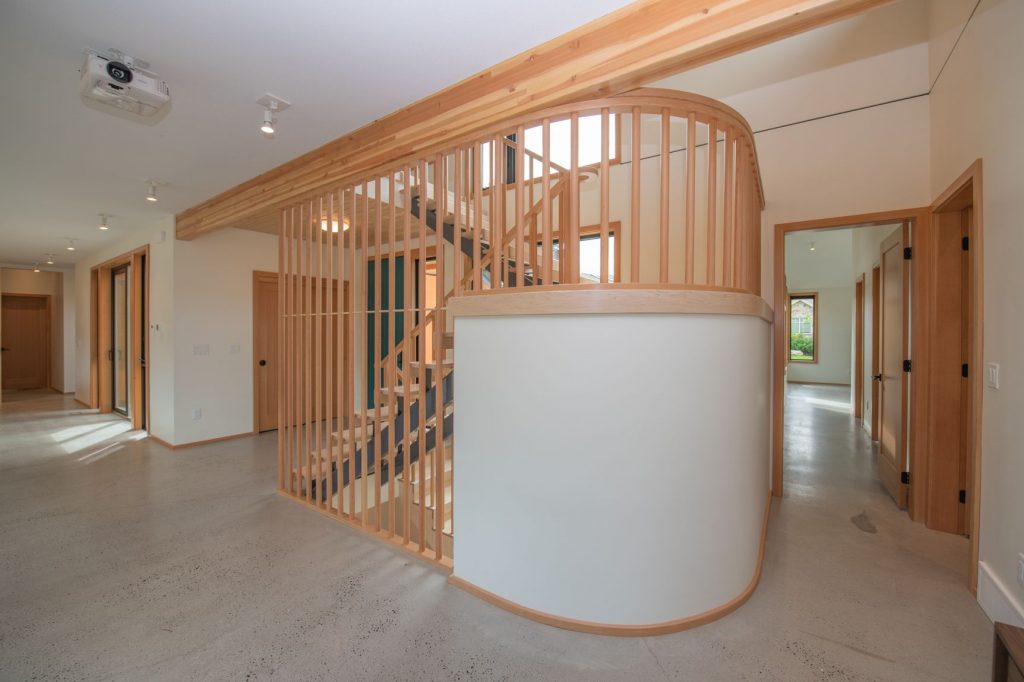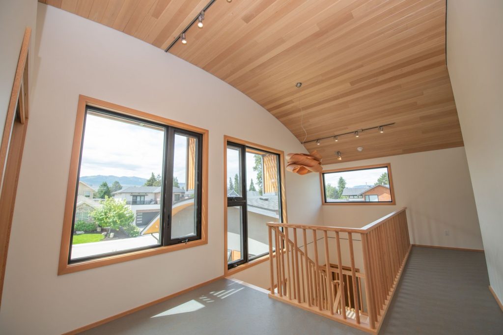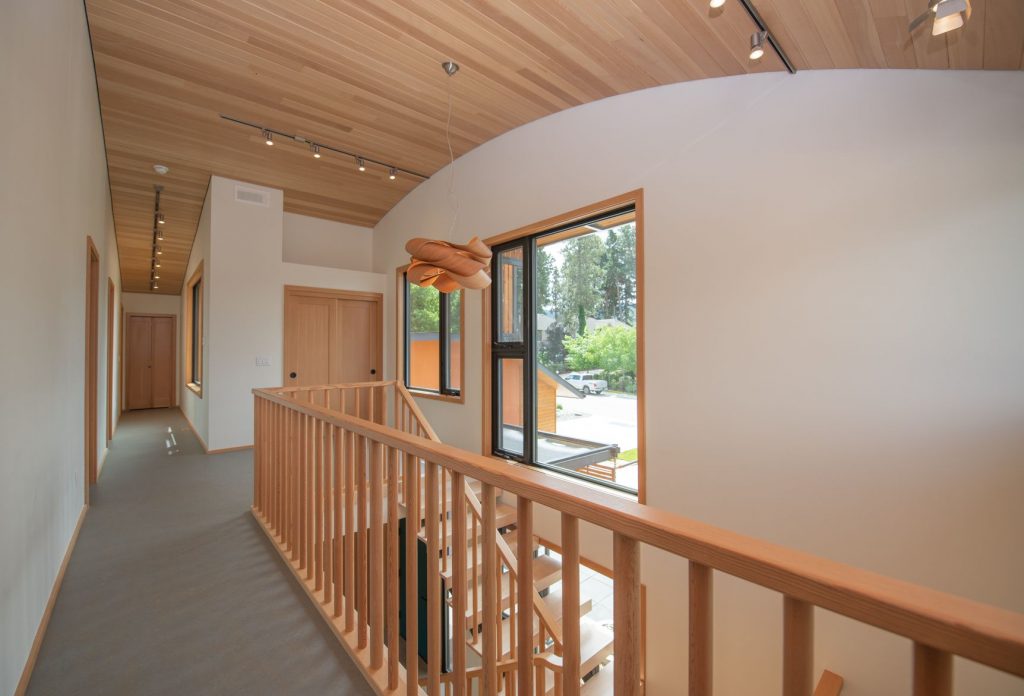 A major focal point is the stunning curved staircase wall adjacent to the living room with floor to ceiling 2” dowel spindles. This custom staircase with steel stringers and solid fir open treads leads to the upper and lower levels. Once upstairs, the impressive arched, clear cedar ceiling spans the entire length of the home. The ¼” shadow reveal at the ceiling edge, track lighting and unique ceiling fixture complete the space. The wood adds texture, color and style to the ceiling, elevating the charm of this impressive home!