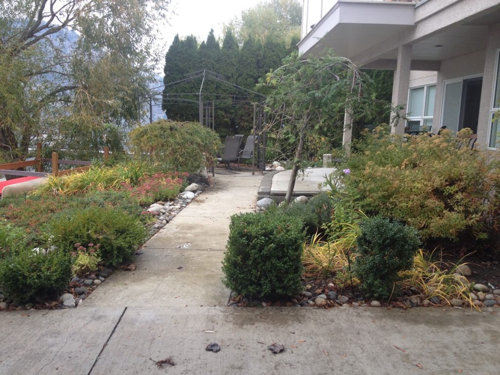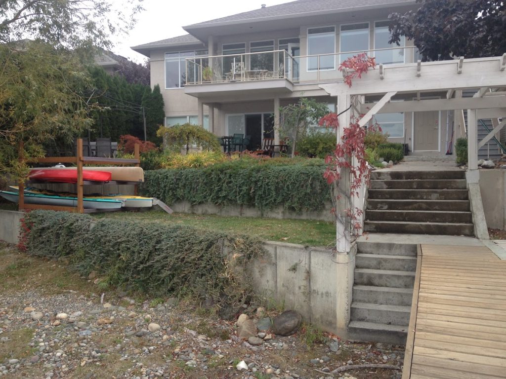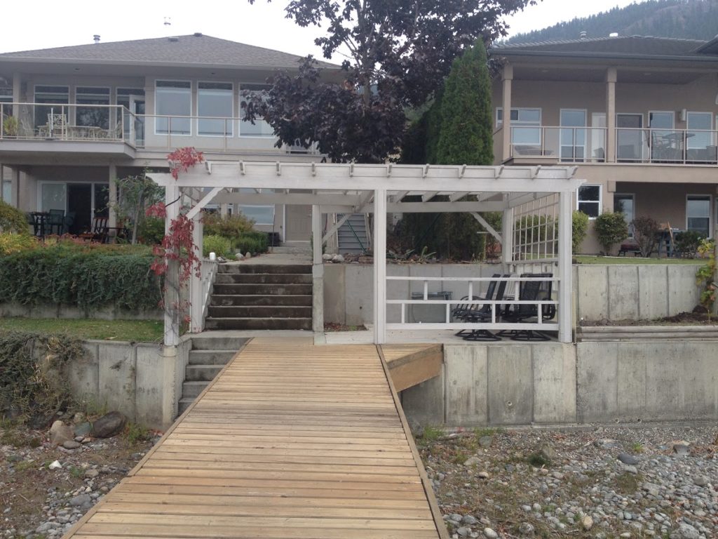 The owners wanted to morph this 20 year old house to take advantage of the amazing view of Okanagan Lake and create a multiple use outdoor space. They wanted privacy on both sides with fences and gates, extra storage, updated exterior and better views from the deck.