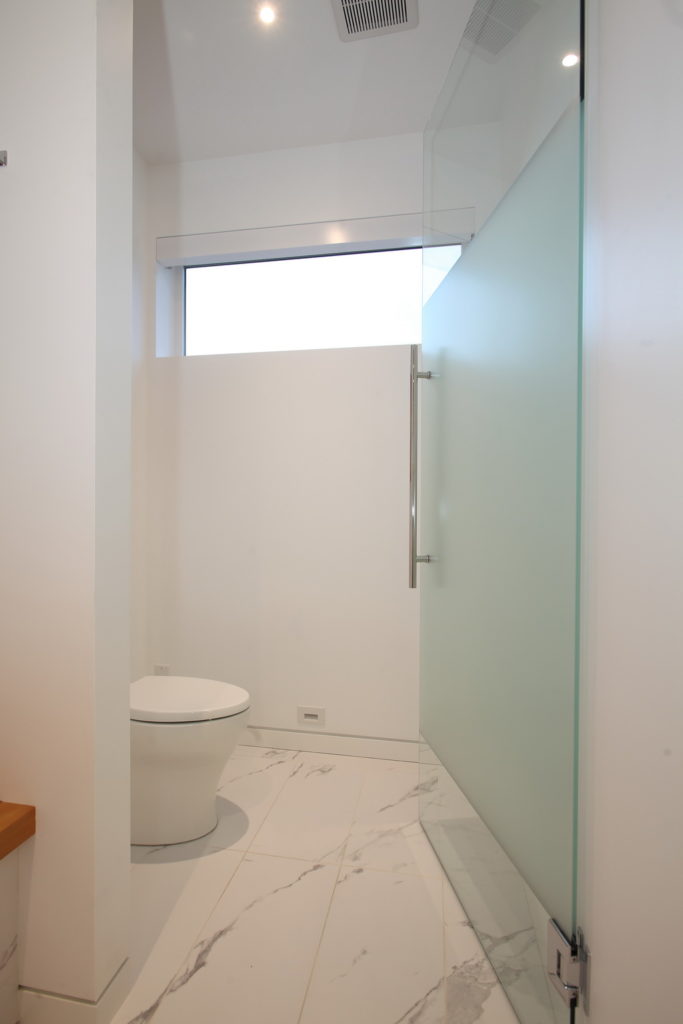 Special features include the open timber stairs with glass rails clipped to powder-coated metal posts, which lead up to the spectacular great room. The horizontal windows in the staircase introduce natural light, and the gas stove fireplace was specifically sought out and placed in the great room so that it does not draw away from the view. The 10′ ceilings with dropped areas help maintain a warm feeling. The contemporary spa-style ensuite comes complete with built in cabinets, floating sinks on one side, and toilet area and steam shower with opaque glass doors on the other. Modernism is built into the home with the use of baseboard reveals and drywall return. The beech engineered hardwood flooring, modern Scandinavian horizontal lines in the beech kitchen, and black quartz countertops create warmth.