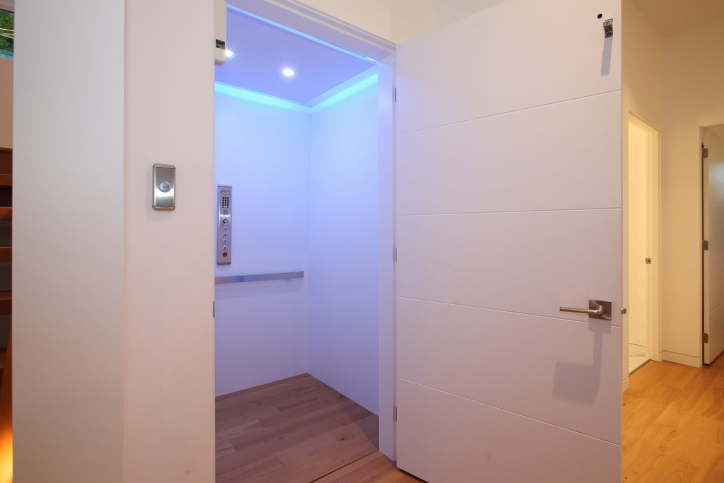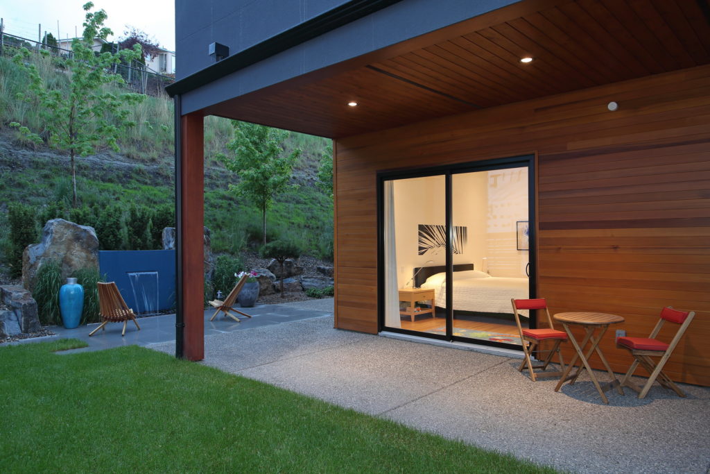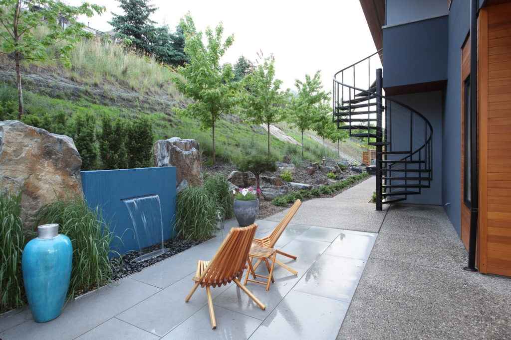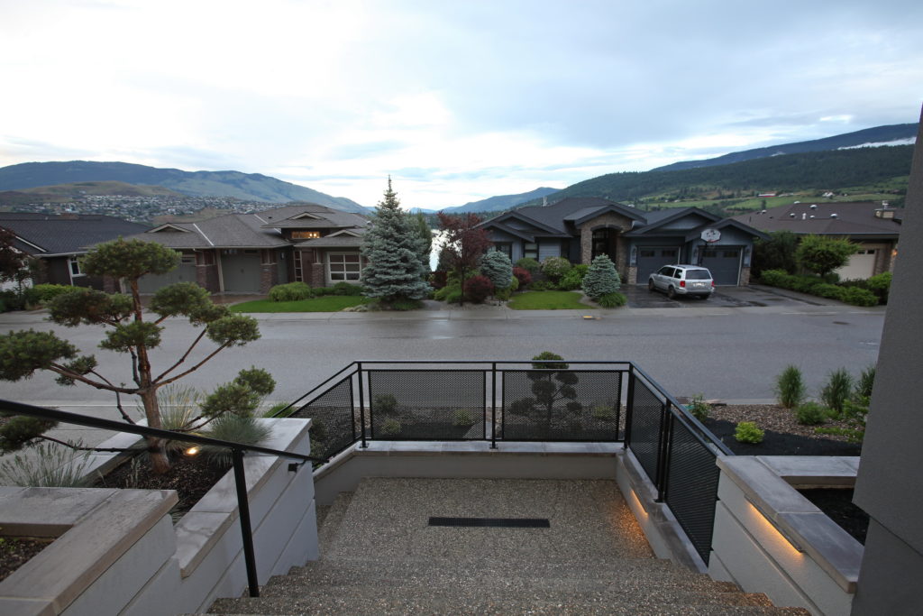 The first floor is the garage and utility level. The second floor is a quiet oasis for the entry, bedrooms and master ensuite with patio and private water feature; no view required. The Guest Experience was a key focus during design, allowing entrance onto the second floor. On the third floor, openness and bright light are key with ample open spaces and outdoor space transitioning from indoor to out with the slider doors. Owners can entertain with the view of Kalamalka Lake from all areas! The large elevator, 3′ doors, and sill-less shower allow this to be an “age in place” home.