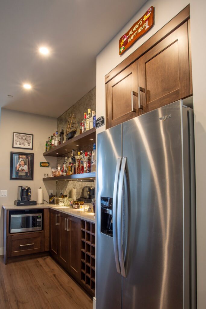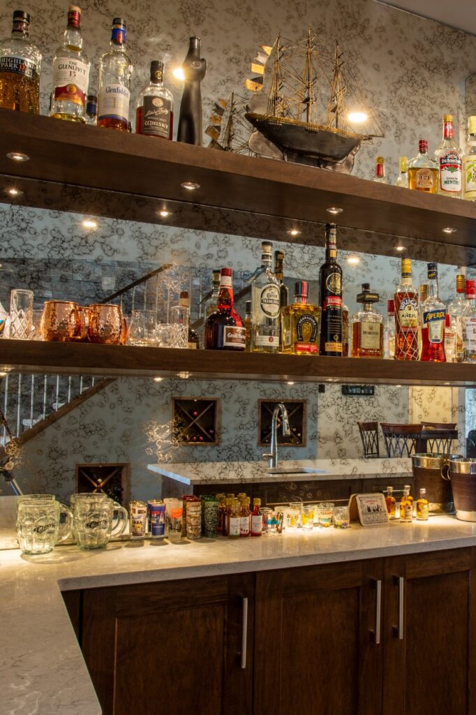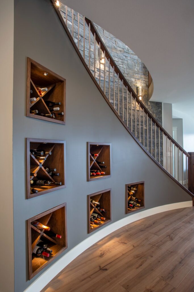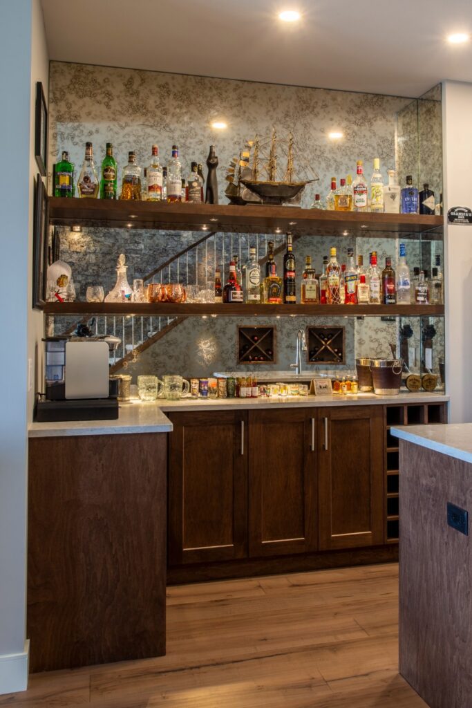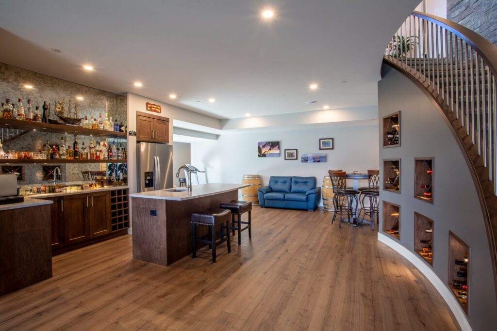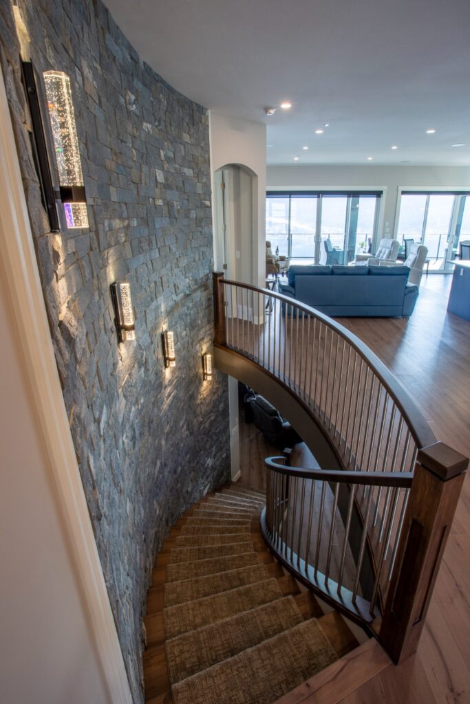 A focal point of the home is the interior staircase, featuring a custom rock wall, a true work of art, adding natural beauty and texture to the space. The lower level is a haven for relaxation and entertainment. A man cave-type space features a custom bar with unique finishes and details from the wood detailed niche wine storage to the rustic mirror backsplash.