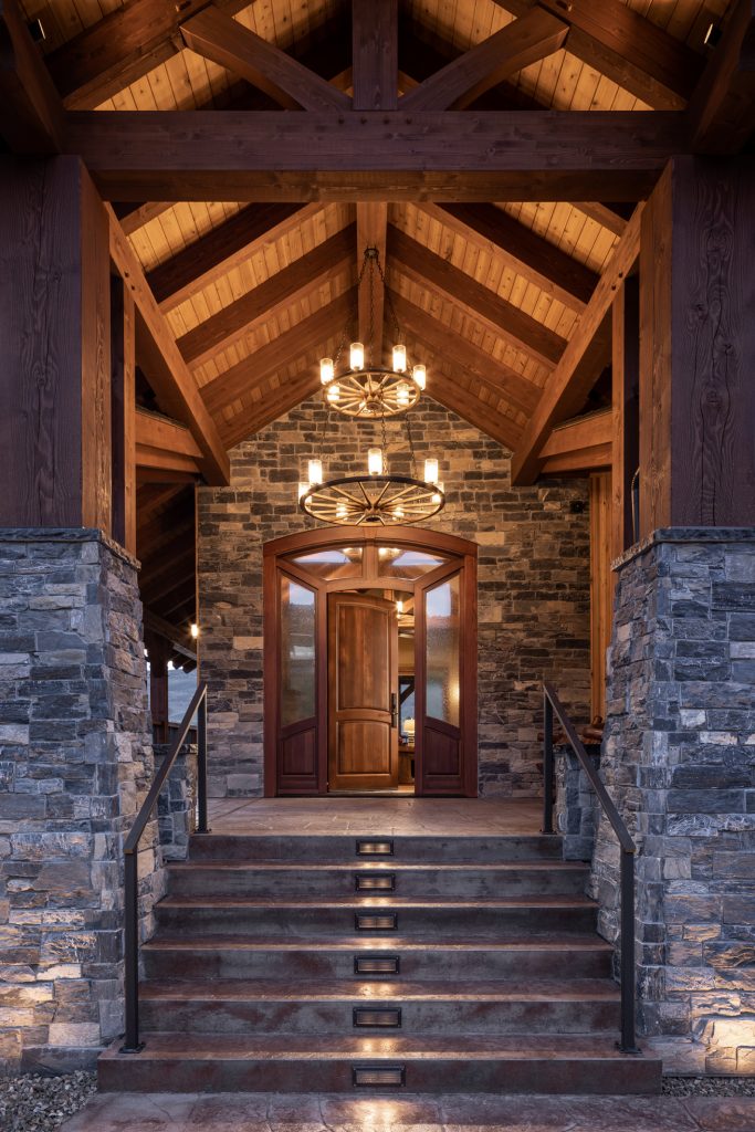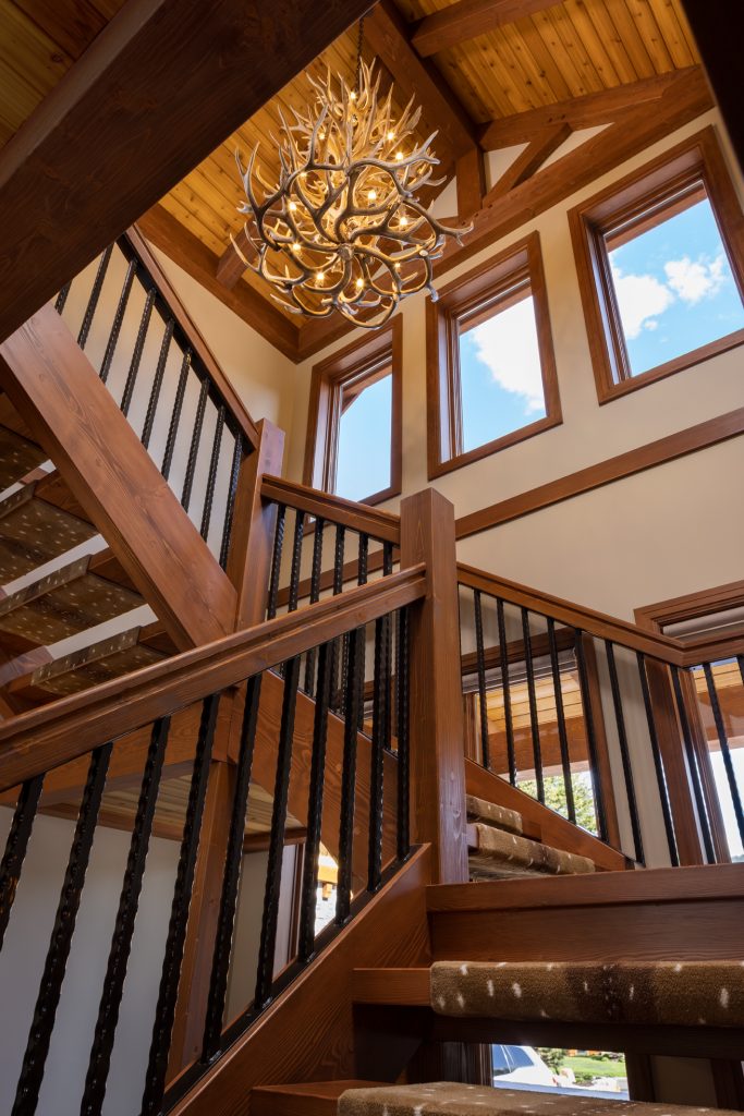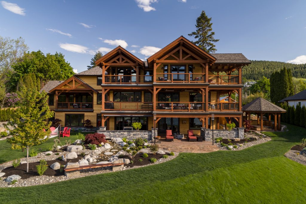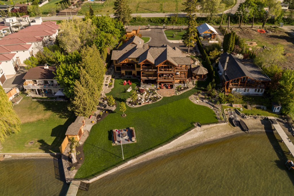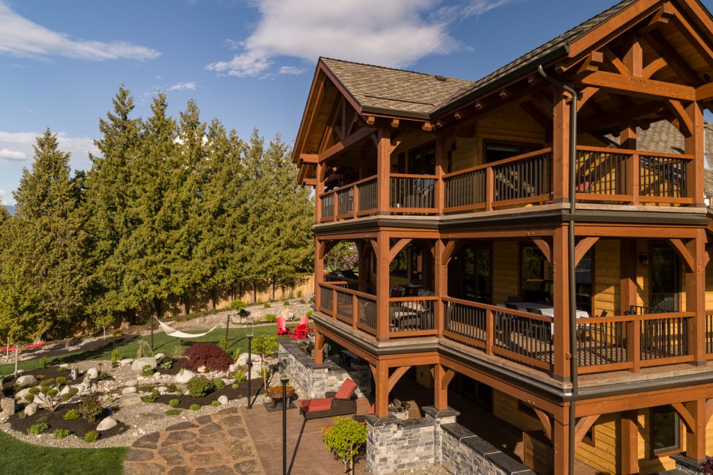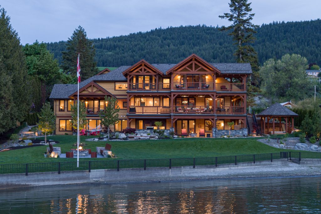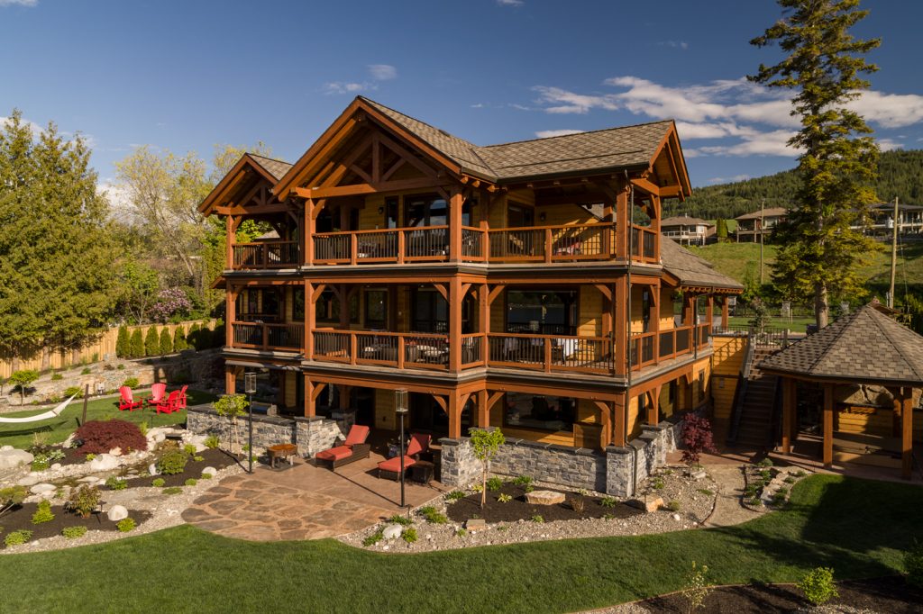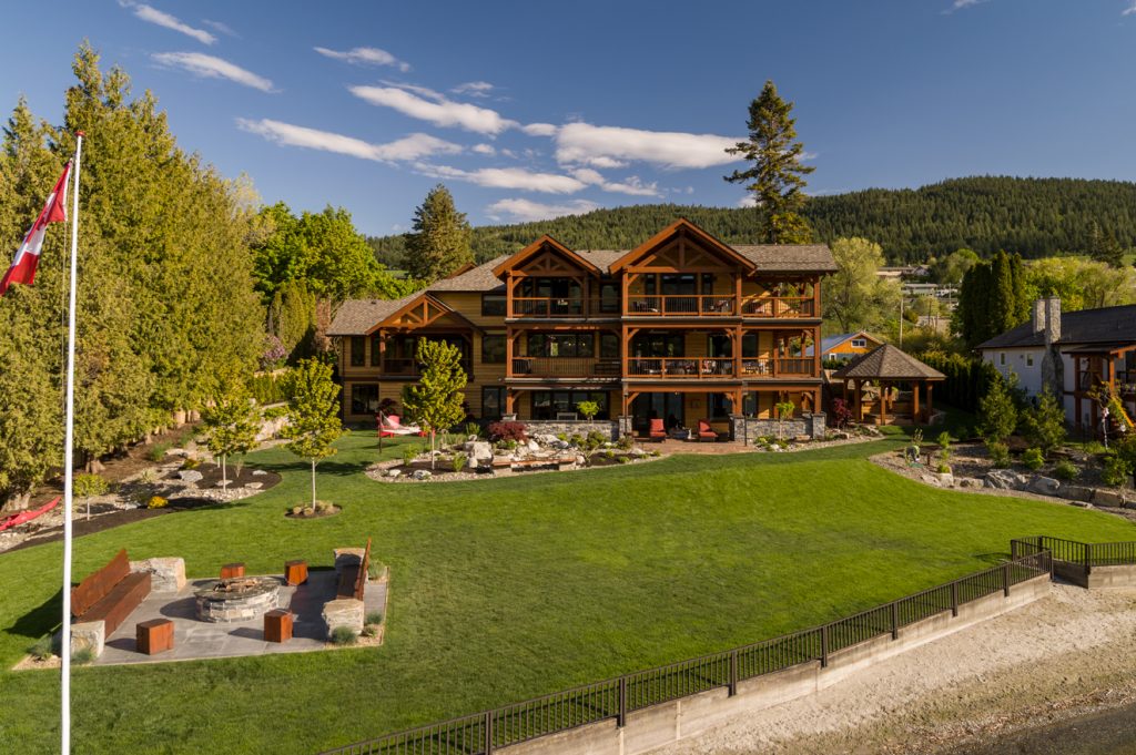 This home features many key design hallmarks. The custom-built indoor/outdoor kitchen is the perfect entertaining space during long Okanagan summers, and is finished with custom antiqued cabinetry. The design uses Glu-lam European Timberframe constructed trusses, posts, beams, stairs and railings. Pine tongue and groove ceilings and custom milled live-edge shiplap wood feature walls create a warm, comforting atmosphere. The home also boasts hand-crafted timber stairs, custom metal railings. A custom wine cellar is the cherry on top of this spectacular Vernon residence.